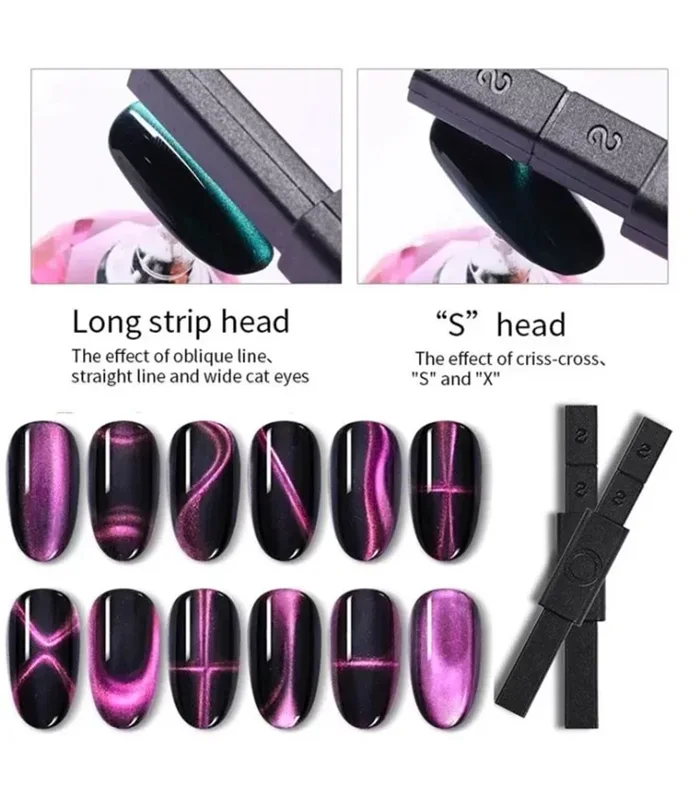 مگنت های چشم گربه ای 5 بعدی و 3 بعدی یک محصول بسیار خاص برای ناخنکاران خاص می باشد چرا که می توانند جدید ترین و متنوع ترین طرح های 3 بعدی و 5 بعدی را با استفاده از این مگنت روی ناخن مشتری بنا به خلاقیت خود ایجاد کرده و مشتری های منحصر به فرد خود را داشته باشند، این مگنت نه تنها ظاهر بسیار ساده و زیبایی دارد بلکه حسن بزرگ این مگنت نسبت به سایر محصولات مشابه در طراحی فوق العاده آن می باشد، چرا که این مگنت فقط نسبت به براده های آهن موجود در لاک ژل چشم گربه ای حساس می باشد و به سایر وسایل فلزی روی میز شما متصل نمیشود. می توانید از هر دو وجه در دو سر این مگنت ها طرح های مختلفی را ایجاد نمایید، در اصل می توان گفت چهار مگنت مختلف در یک محصول گنجانده شده است.